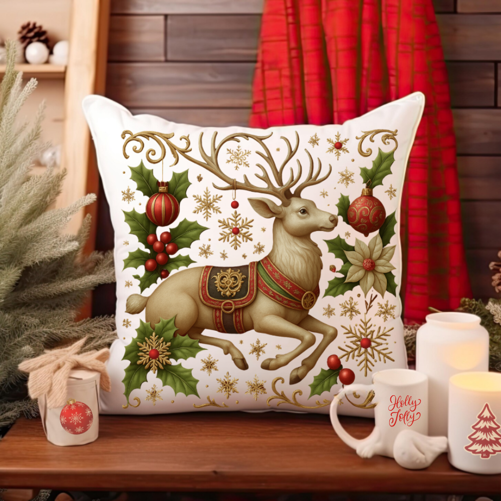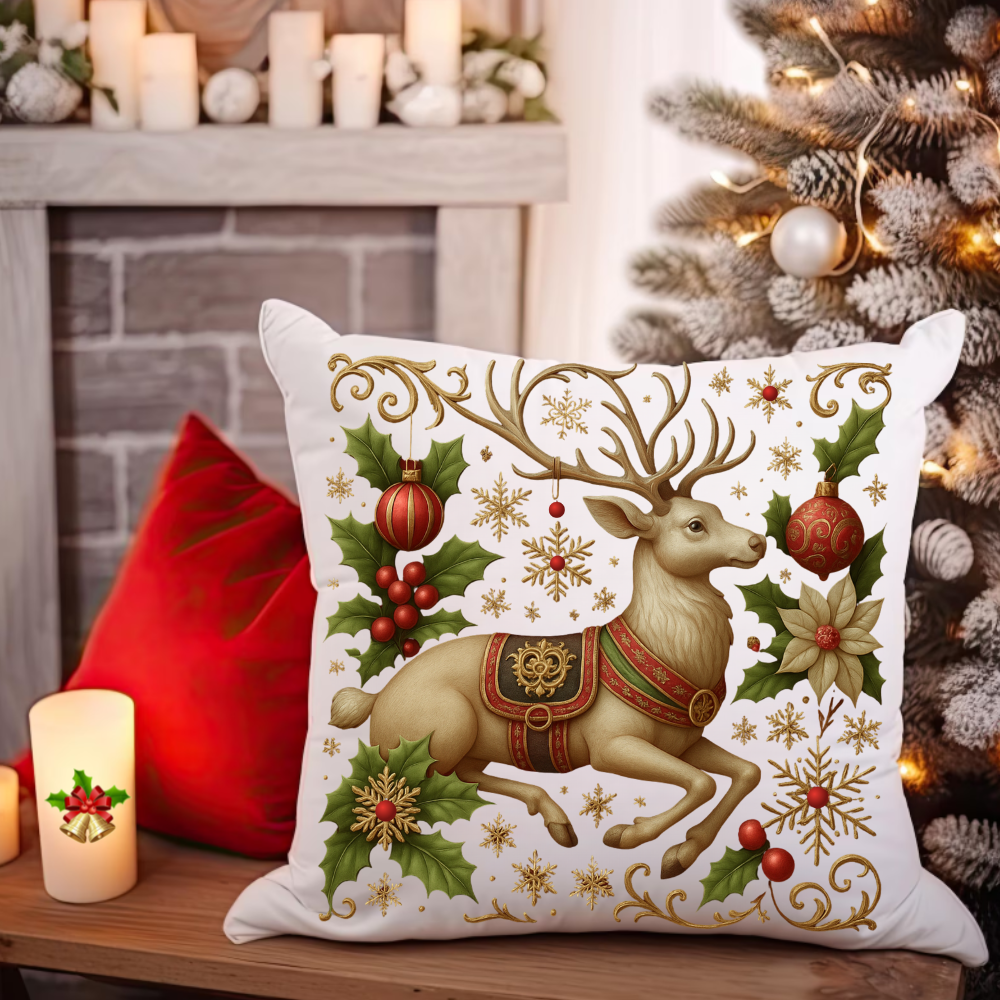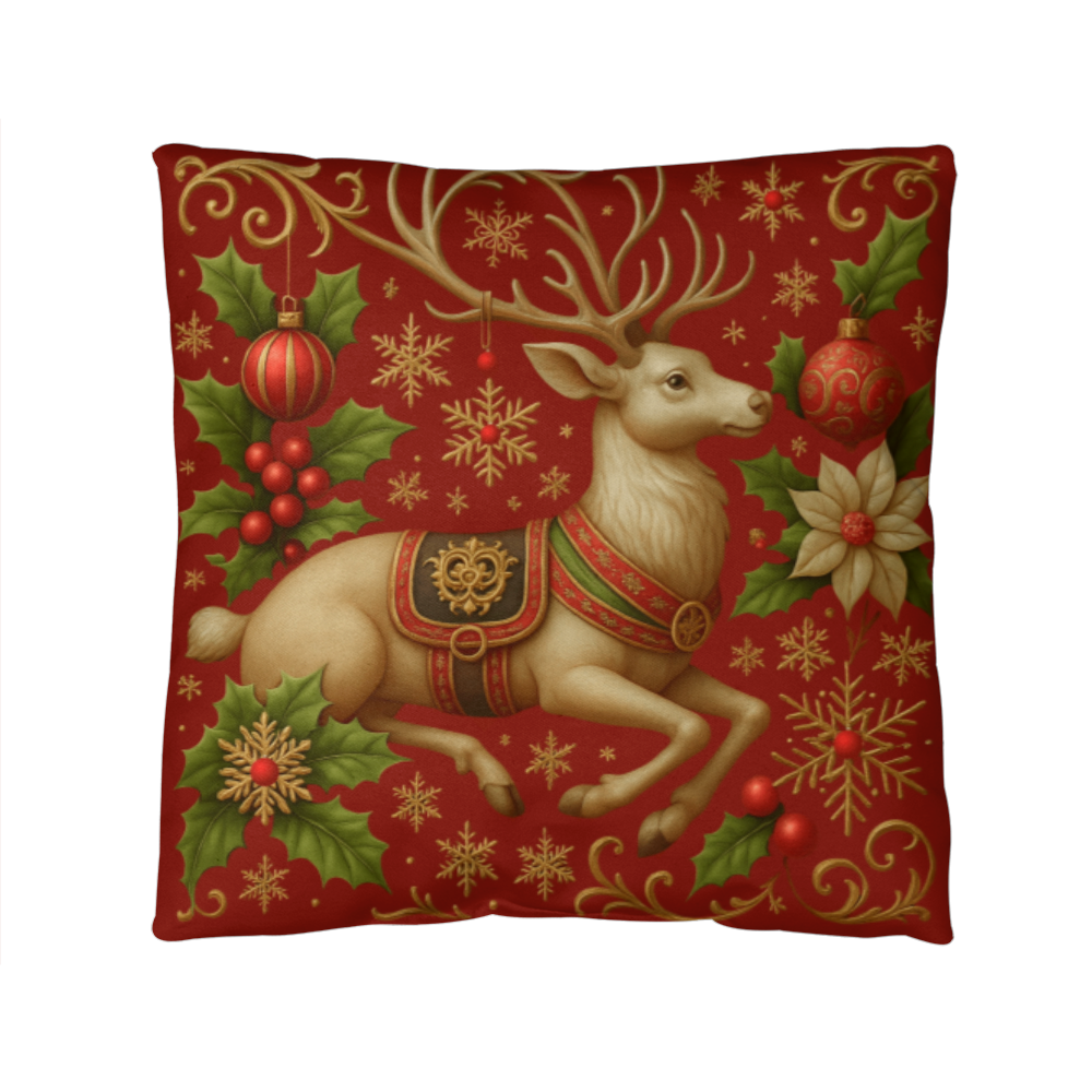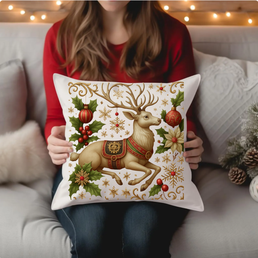 🎄 Add festive charm to your living room with this beautifully designed Reindeer Christmas Pillow. Featuring intricate red, gold, and green holiday detailing, this cozy accent cushion brings warmth and elegance to your winter décor. Perfect for couches, beds, or gift giving this holiday season.