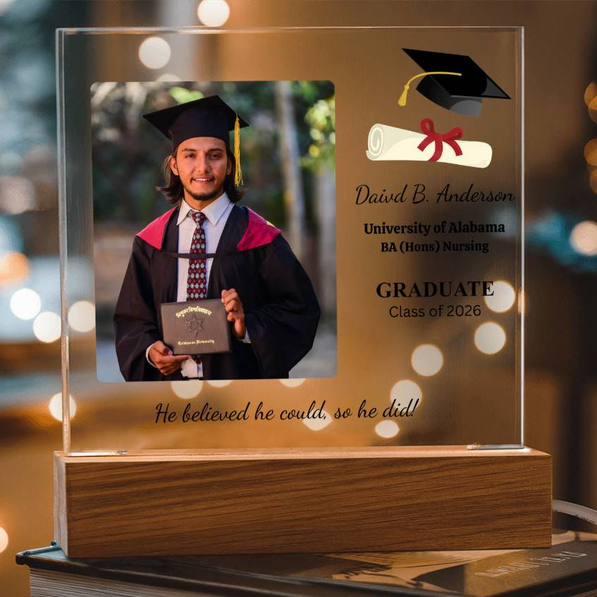 Your plaque will be crafted from premium acrylic with a professionally printed design for a polished look. It comes with a stylish wooden LED base, and you can choose between a USB plug-in option OR a cordless battery-operated option (requires 2 AAA batteries, not included). Both LED bases feature 7 vibrant colors, allowing the user to customize the lighting with various color changes and dynamic cycles.